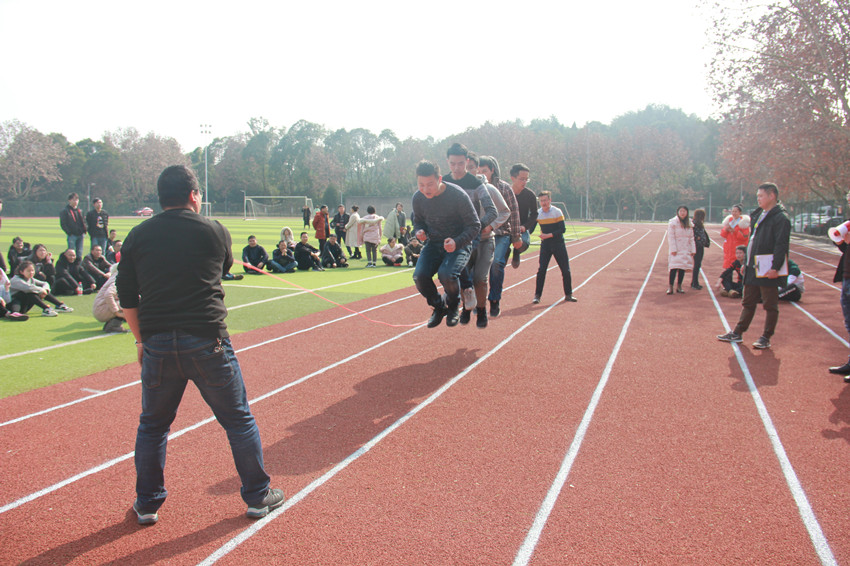 不久由于求胜心切,各个赛道上就呈现出一派热闹欢腾的景象:有的腿开始“打架”,有的拉扯得跑不了了干脆停下来慢慢走,有的索性直接改跑为跳,还有的跑着跑着摔翻在地,洋态可憨掬···两旁的啦啦队连“加油”都顾不上喊了,笑得前仰后合,泪花都快出来了。 虽然是一片喜庆、洋态百出,但是各支队伍还是慢慢找出了默契,无论是摔倒还是用别出心裁的方式“跑”,大家始终怀着强烈的集体荣誉感,相互鼓励着、搀扶着跑完全程!